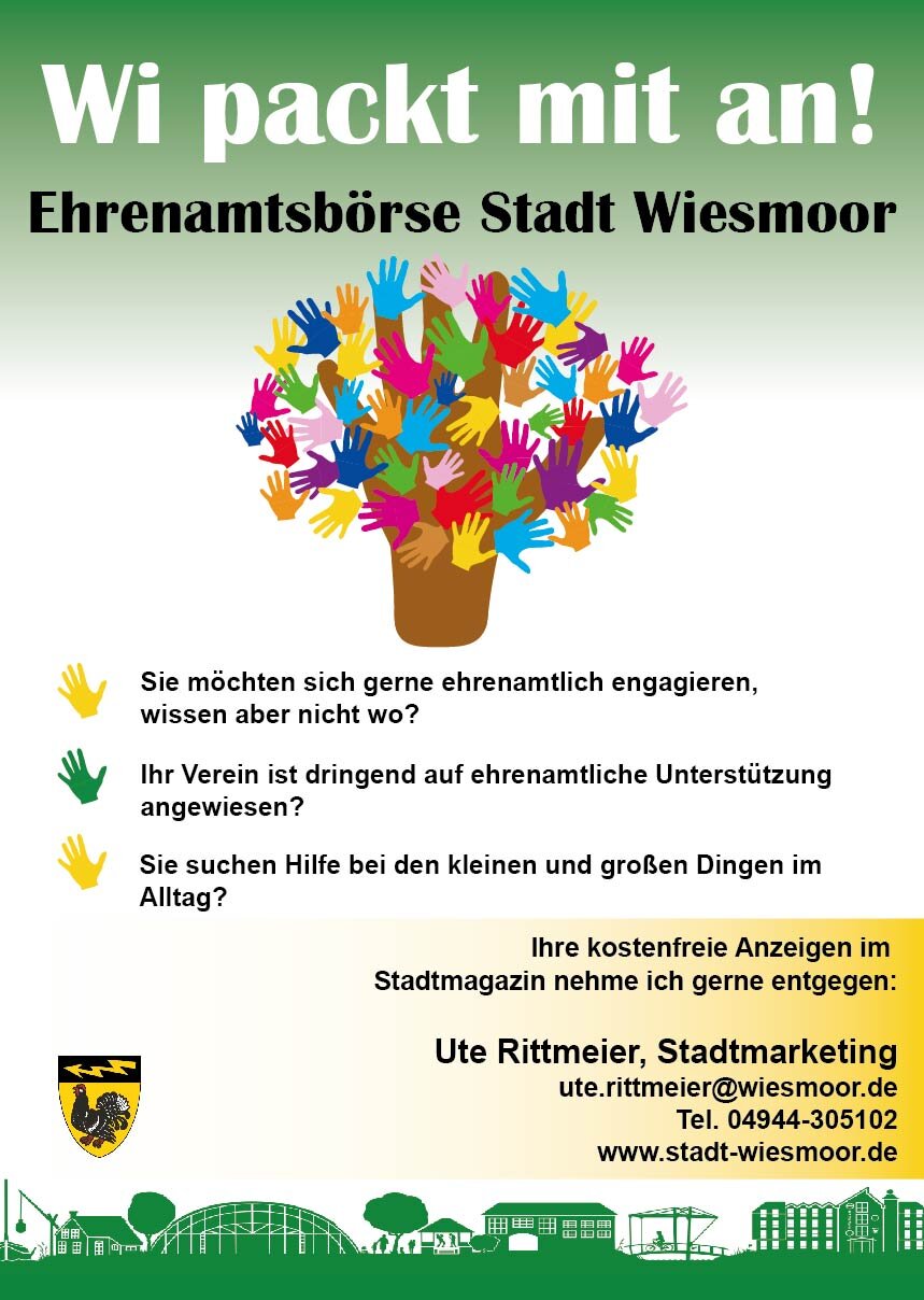 Die Stadt Wiesmoor möchte Ihnen die Möglichkeit geben, im Stadtmagazin unter der Rubrik „Ehrenamtsbörse“ eine „Biete“ oder „Suche“ Anzeige kostenfrei aufzugeben.
